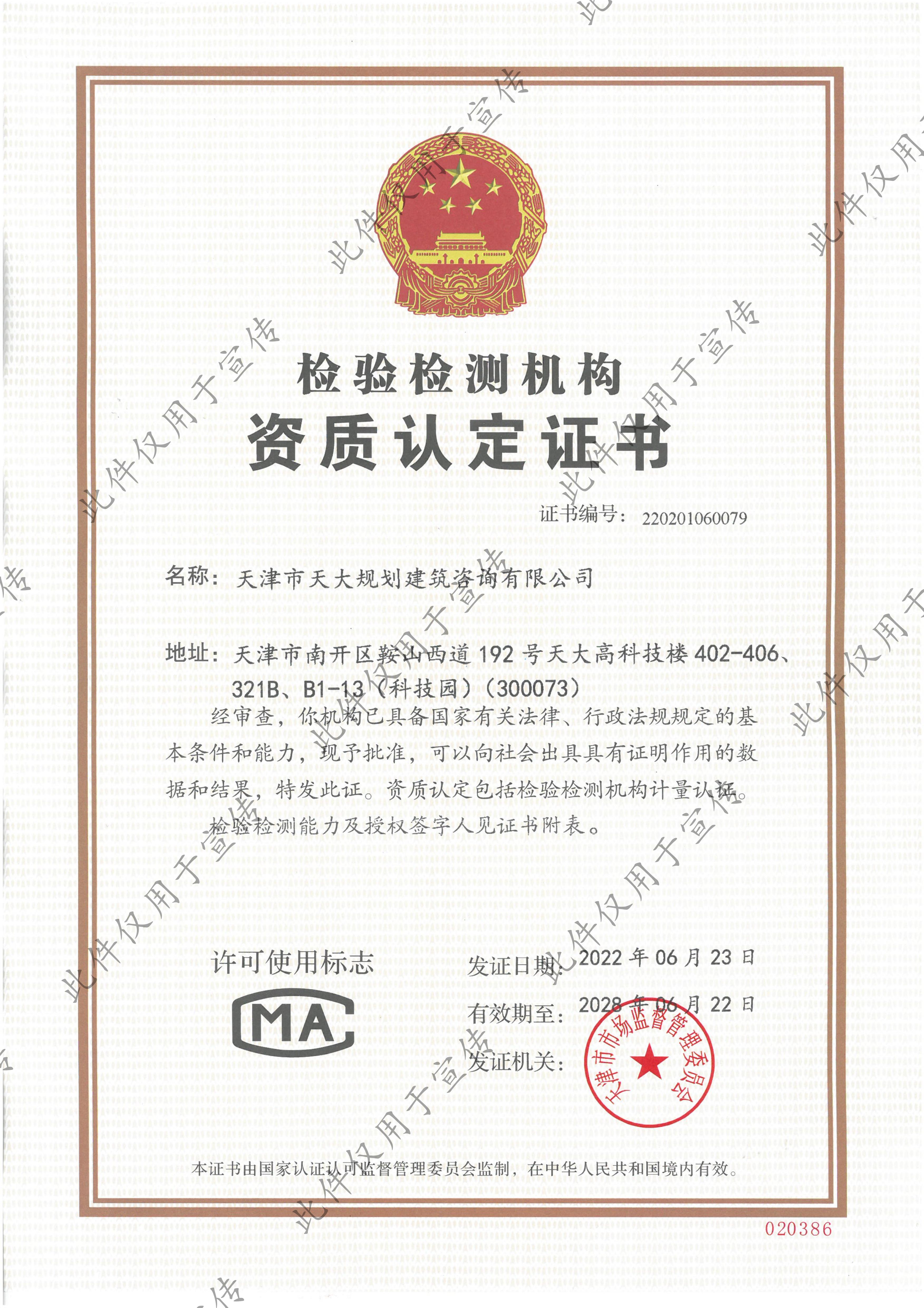 近日,天津大學(xué)建筑設(shè)計(jì)規(guī)劃研究總院有限公司全資子公司——天津市天大規(guī)劃建筑咨詢有限公司順利通過CMA評(píng)審組評(píng)審,經(jīng)天津市市場監(jiān)督管理委員會(huì)批準(zhǔn),取得檢驗(yàn)檢測機(jī)構(gòu)資質(zhì)認(rèn)定證書(CMA)。認(rèn)定獲批的檢測范圍包含混凝土結(jié)構(gòu)、砌體結(jié)構(gòu)、鋼結(jié)構(gòu)、建筑節(jié)能等四大類別,共26項(xiàng)參數(shù),即日起可開展相關(guān)檢驗(yàn)檢測業(yè)務(wù)。