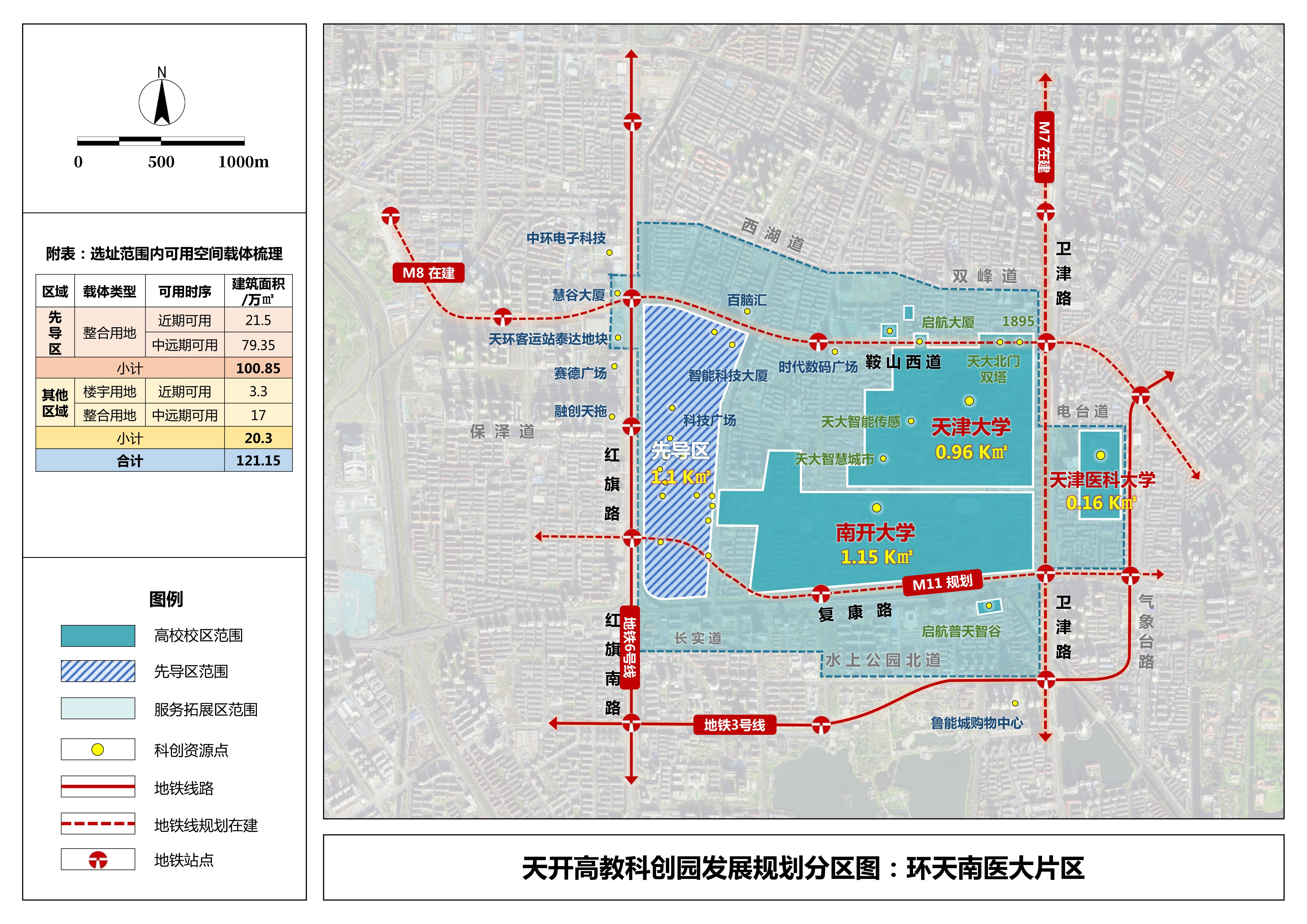 核心區內劃定“鞍山西道—白堤路—復康路—紅旗路”合圍區域為先導區,占地面積約1.1平方公里。以天津科技廣場為核心、科研西路為中軸向兩側延伸的11個空間載體為主要供給,可提供總占地面積22.05萬平方米、總建筑面積100余萬平方米的載體空間。