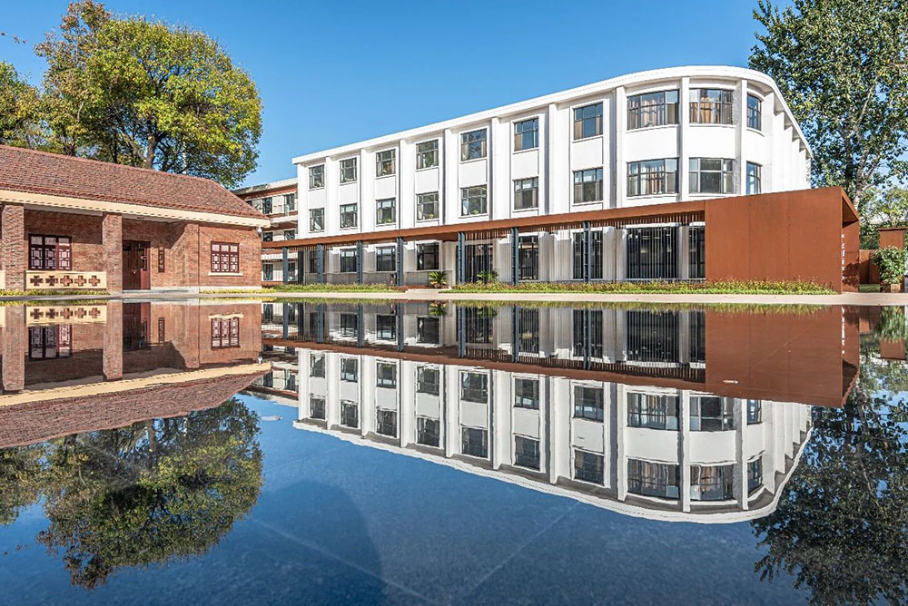 蘇聯(lián)專家樓會議室作為一機床廠史館,內(nèi)部以一機床廠整體工業(yè)化發(fā)展變革為核心,展示原有的工藝生產(chǎn)過程,體現(xiàn)一機床廠的輝煌歷史。景觀在設計中考慮在不影響建筑風格同時,在中心位置設計一方靜水,形成四水歸堂、水聚天心別具的景觀風格。水面中映襯的建筑倒影,使得整個場地更加靈動。