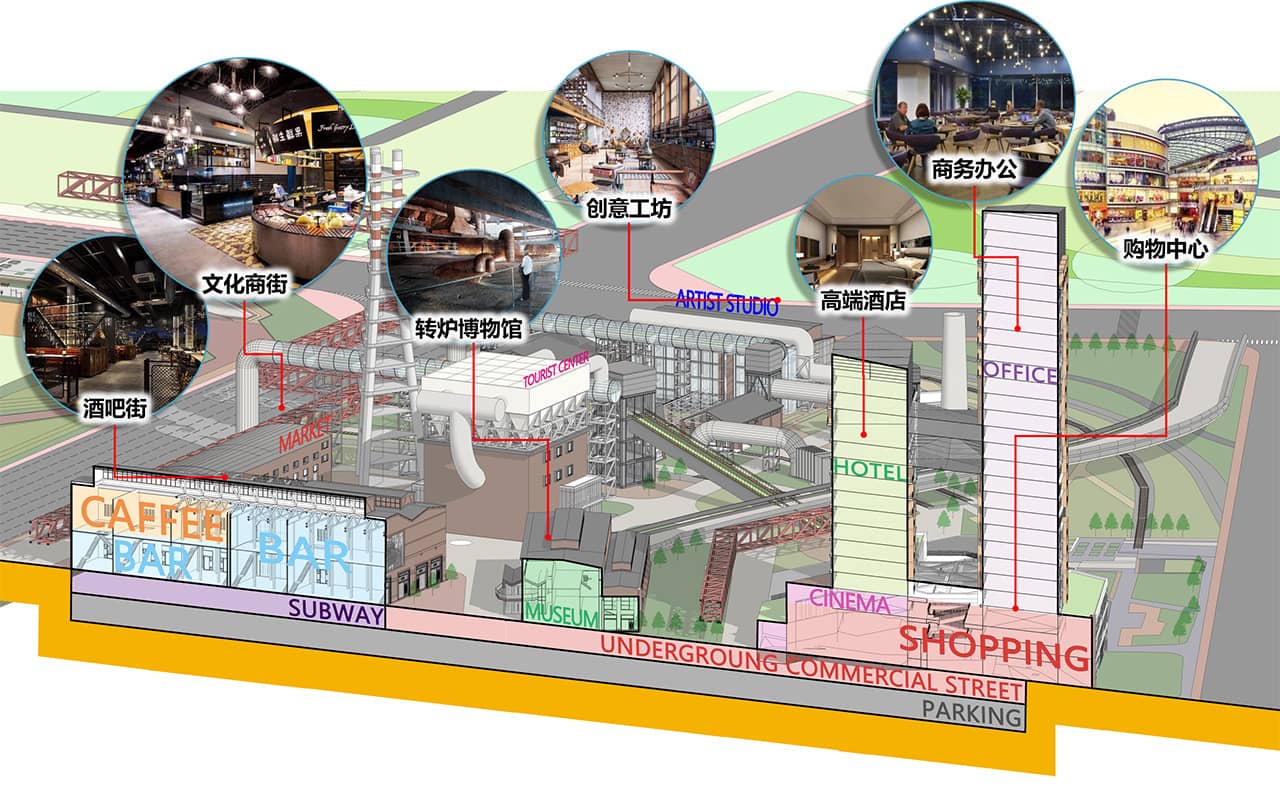 依托燒結、高爐、轉爐、連鑄、型鋼等核心車間構筑核心熱點。將3200高爐結合熱風爐改造為綠色文創中心和特色主題酒店,周邊結合原凈水廠改造為唐鋼湖,構建“水映唐鋼”城市熱點;將冶鐵區轉型為兼具自然人文風貌和都市創意特征的文化標地。巍然矗立的唐鋼高爐在此重獲新生,將伴隨著老唐鋼人的記憶永遠矗立在新一片天空中。