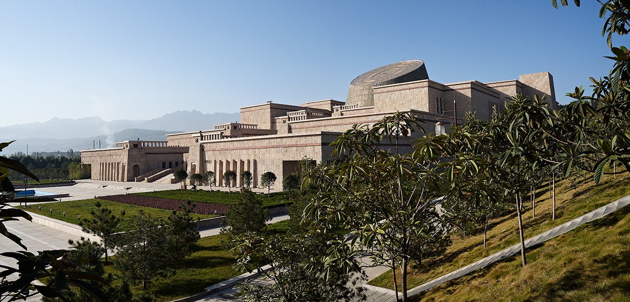 由天大設計總院設計完成的寶雞市青銅器博物院建于寶雞市石鼓山風景區內,總用地面積約5.08萬平方米,西靠石鼓山,東接茵湘河,背山面水,南臨301國道,地勢西高東低。