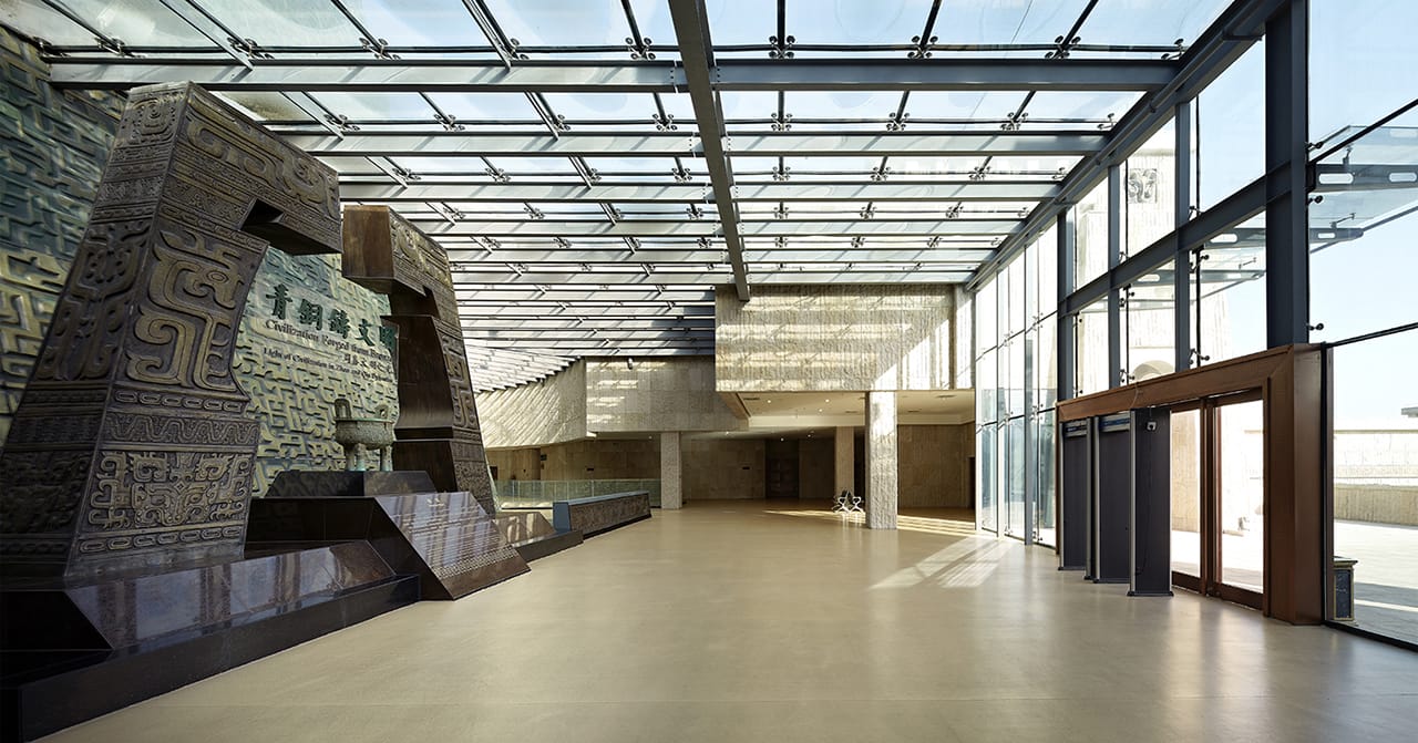 青銅文化:青銅器作為博物院的主題在設計中得到強調。橢圓形的共享廳內外均采用青銅板飾面,在黃土高臺的襯托下如破土而出的青銅器,玻璃材質的頂面向茵湘河方向傾斜,于山水之間熠熠生輝。