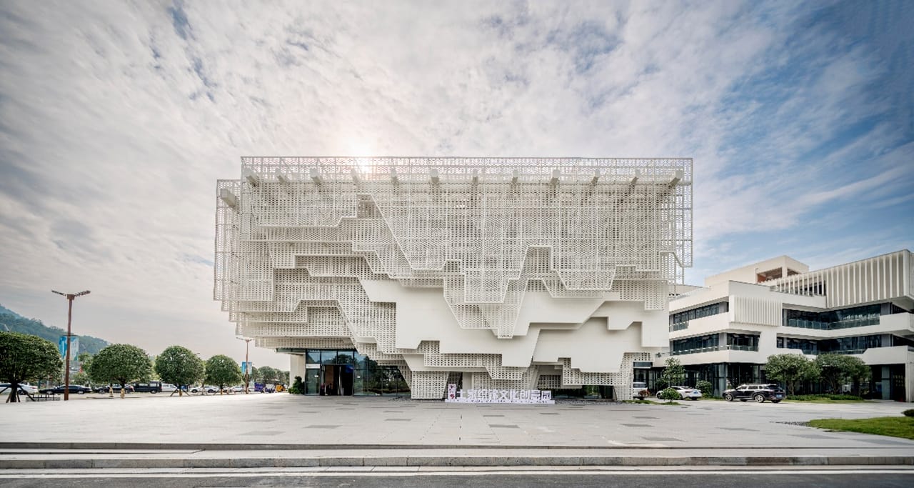 織錦博物館將張家界特有的天然山水和土家織錦相互疊合——層層金屬織錦相互交疊,陰陽虛實(shí)之間,交替轉(zhuǎn)變,最終通過凹凸有致的輪廓與疏密漸變的穿孔,疊合出張家界的山水映像,變化萬千,極大地拓展了想象的空間。