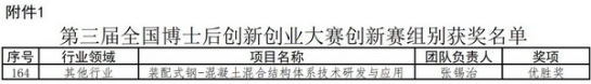 近日,第三屆全國博士后創新創業大賽全國總決賽獲獎名單正式公布。天津大學建筑設計規劃研究總院有限公司(以下簡稱:天大設計總院)博士后團隊“裝配式鋼-混凝土混合結構體系技術研發與應用”項目成功入圍全國總決賽,并斬獲優勝獎,填補了天大設計總院在該國家級賽事中零獎項的空白,為科研創新成果再添一項重要榮譽。
