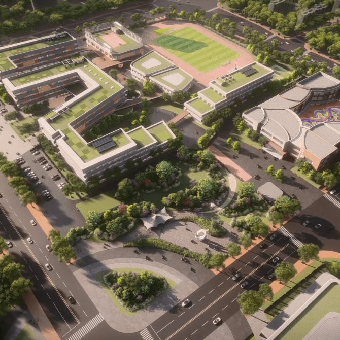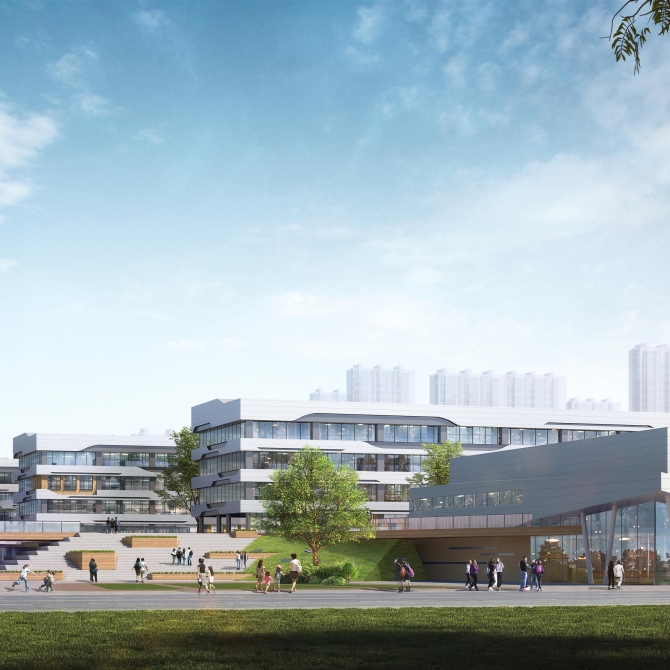 總體布局,景觀公園、大禮堂、游泳館、圖書綜合樓等重要公共建筑居中布置,形成中心共享區,共享區為四個校區同時服務,增加了校園功能場館的使用效率,亦可與社會開放,形成校城共享。高中、初中、小學、幼兒園四所學校分布四周,環繞簇擁,重要建筑形象均向城市展示,凸顯校園品質。