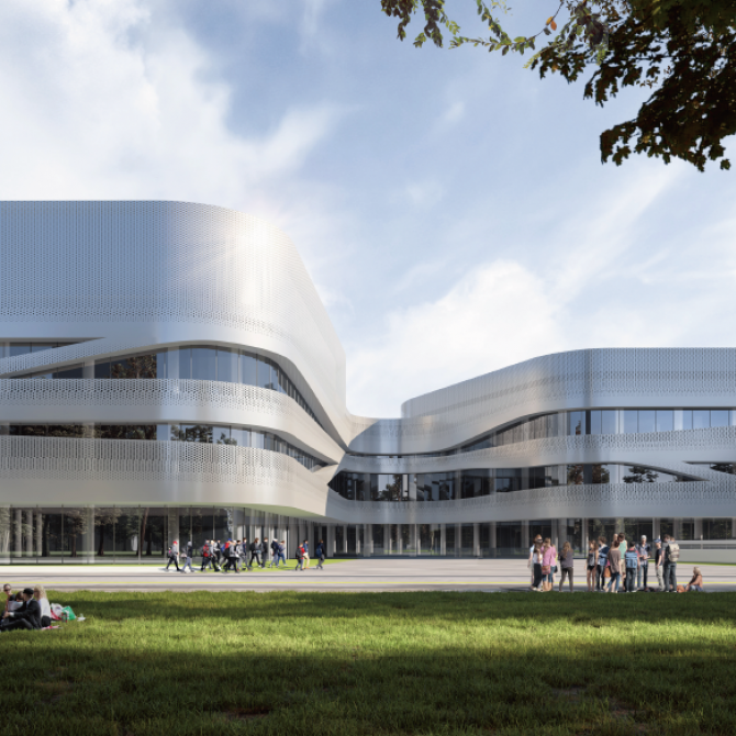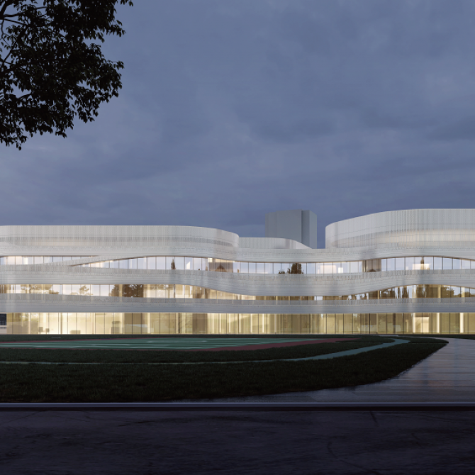 科技文體中心以體量分散,曲線流動(dòng)的建筑形態(tài)與濱江商務(wù)區(qū)整體的建筑風(fēng)格相協(xié)調(diào),同時(shí)為商務(wù)區(qū)注入新的活力。建筑立面以水平向展開(kāi),圓潤(rùn)的輪廓以及交錯(cuò)流動(dòng)、充滿(mǎn)韻律感的曲線賦予文體中心活潑、動(dòng)感的建筑形象。水平向的曲線為文體中心帶來(lái)了不斷變化的空間形式,使建筑在不同的視角呈現(xiàn)出不同的面貌。立面材質(zhì)選用穿孔鋁板幕墻與玻璃幕墻的組合,營(yíng)造出文體中心動(dòng)感且充滿(mǎn)未來(lái)感的氣質(zhì)。