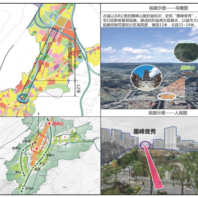 文化導(dǎo)向的精細(xì)規(guī)劃——保護(hù)歷史文化遺產(chǎn),傳承歷史空間脈絡(luò)。劃定自古城廣場(chǎng)向東眺望五指山、自古橋南望東山、自古城以南眺望鳳凰山濕地的景觀視廊,延續(xù)織金主城區(qū)“群山屏列一水貫城,河納百泉山帶千峰”的自然山水與人文建設(shè)完美結(jié)合的空間格局,喚起、保留當(dāng)?shù)鼐用駥?duì)織金風(fēng)貌的記憶。