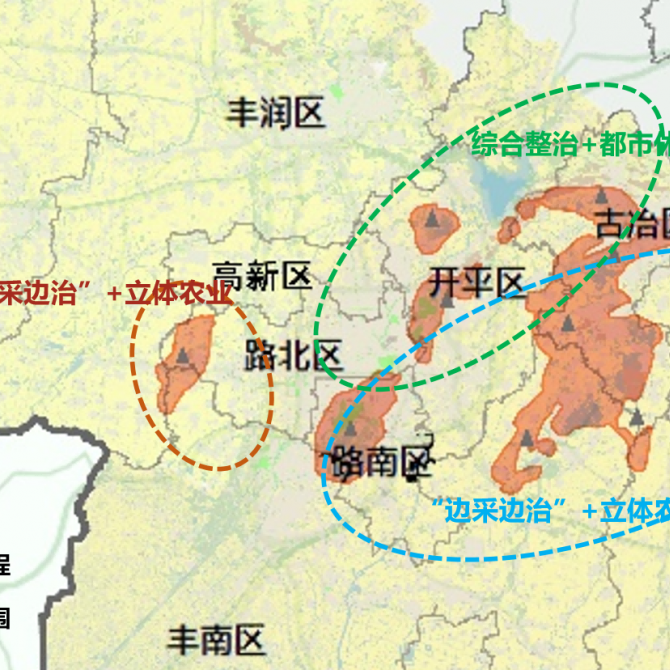 以生態(tài)產(chǎn)品價值實現(xiàn)導向,顯性修復與隱性修復相統(tǒng)一,建立“格局引領-過程耦合-分區(qū)集成”的系統(tǒng)化修復路徑。錨固生態(tài)安全格局、劃分生態(tài)修復二級分區(qū),識別7類重點修復區(qū)域,其中采煤塌陷區(qū)著重探索“生態(tài)+”治理、利用型修復模式。