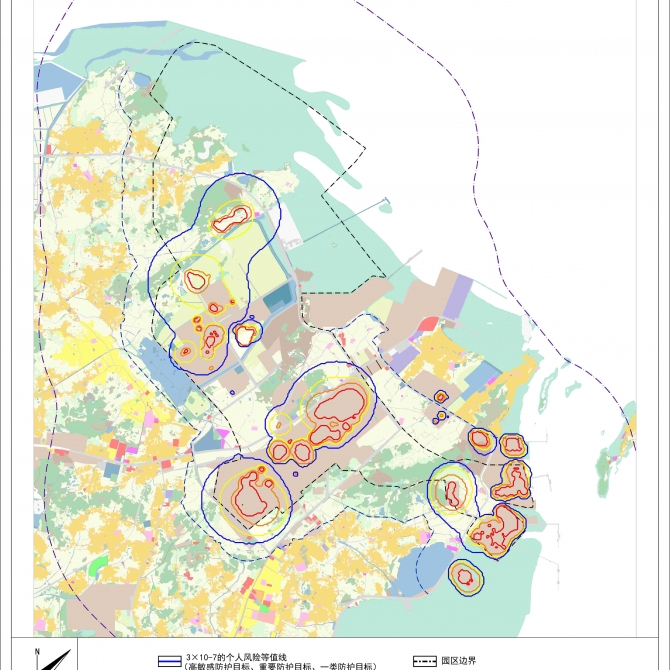 依據園區安全分析,明確地上用地開發不能置于園區的個人風險影響和嚴重事故傷害、嚴重熱輻射半徑范圍內,地下空間利用不能損害周邊已建成項目的利益。加強地上、地下一體化研究,提高土地資源利用效益,統籌兼顧產業發展與用地開發強度。