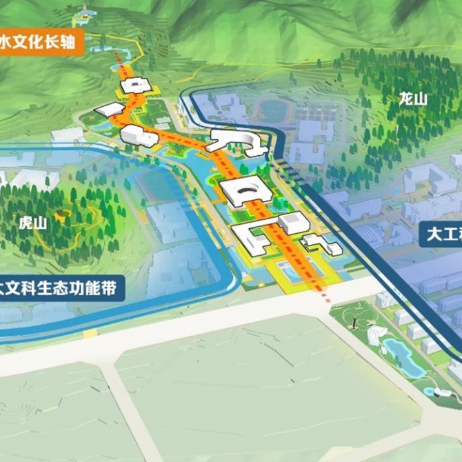 山水文化長(zhǎng)軸兩側(cè)依托西校區(qū)和北校區(qū),動(dòng)態(tài)拓展,圍繞龍山、虎山形成兩條兼具靈活性、融合性,符合中國(guó)未來(lái)大學(xué)發(fā)展趨勢(shì)的大文科、大工科生態(tài)功能帶。