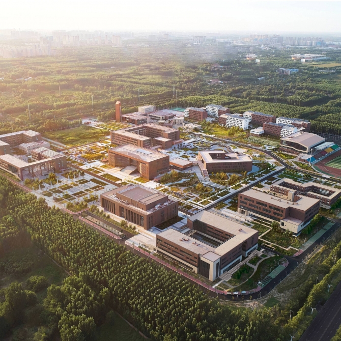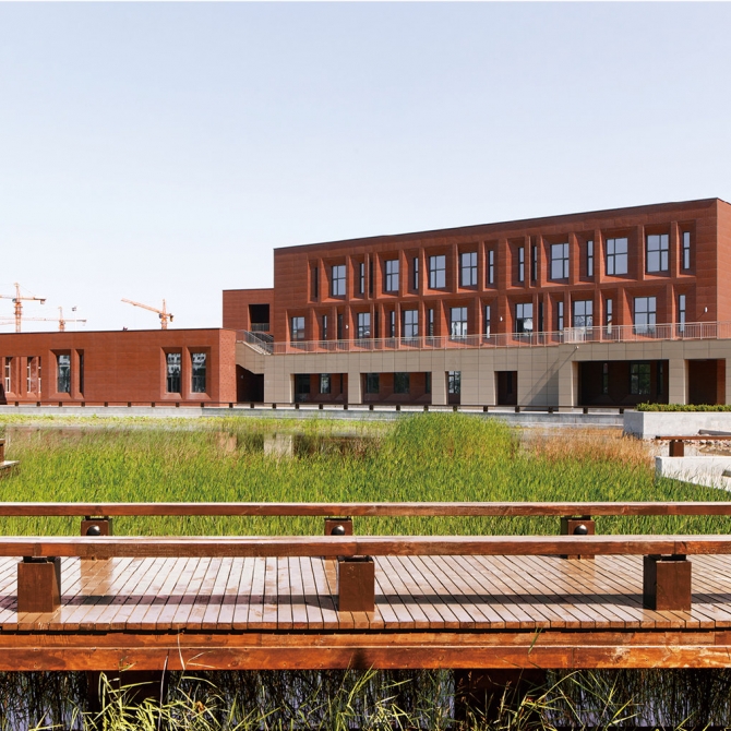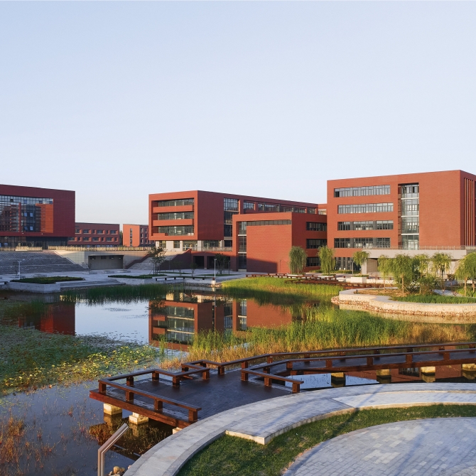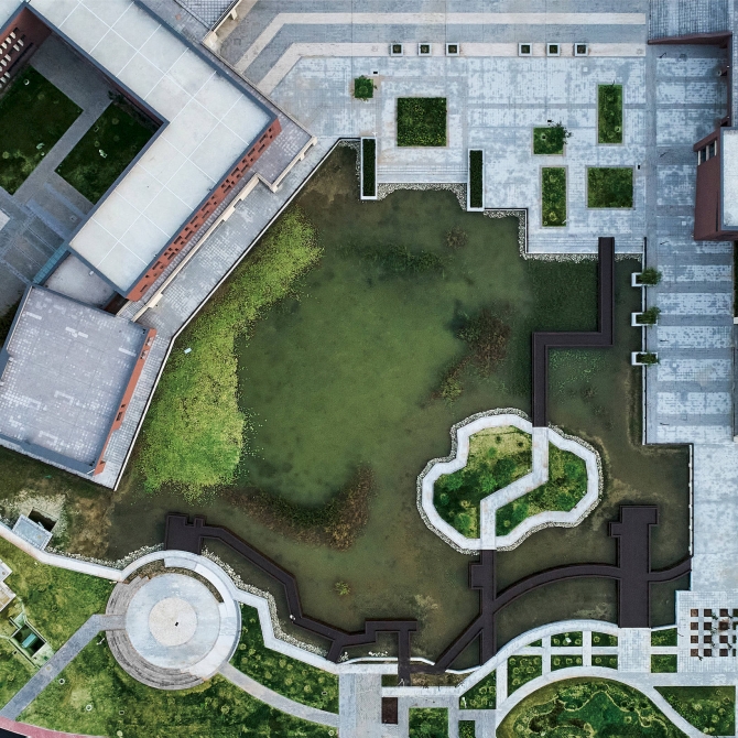 德州高級(jí)師范學(xué)校新校園位于德州市郊郁郁蔥蔥的田園濕地環(huán)境中,設(shè)計(jì)盡可能傳承原有的田園生態(tài)地文基底,結(jié)合校園教學(xué)生活功能的實(shí)際需求,實(shí)現(xiàn)生態(tài)本底的有效保留和轉(zhuǎn)譯,將濕地景觀與校園環(huán)境相融合形成一個(gè)豐富多樣、自然野趣、綠色智慧的生態(tài)校園。