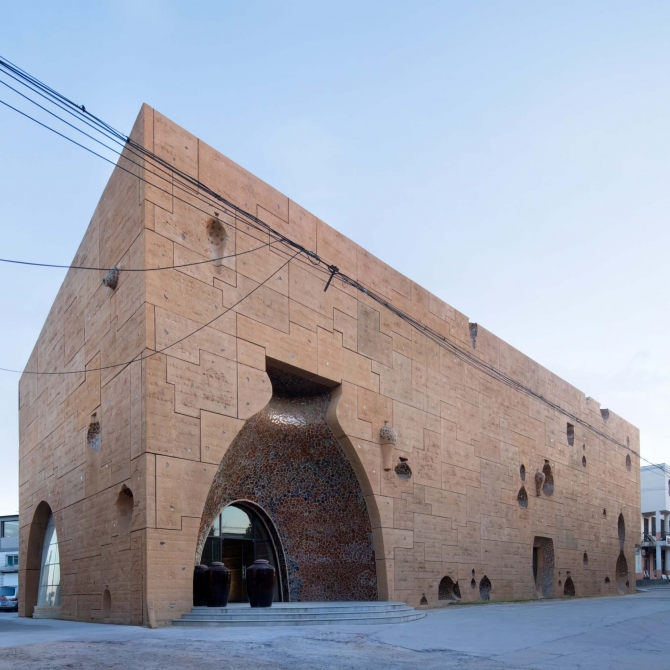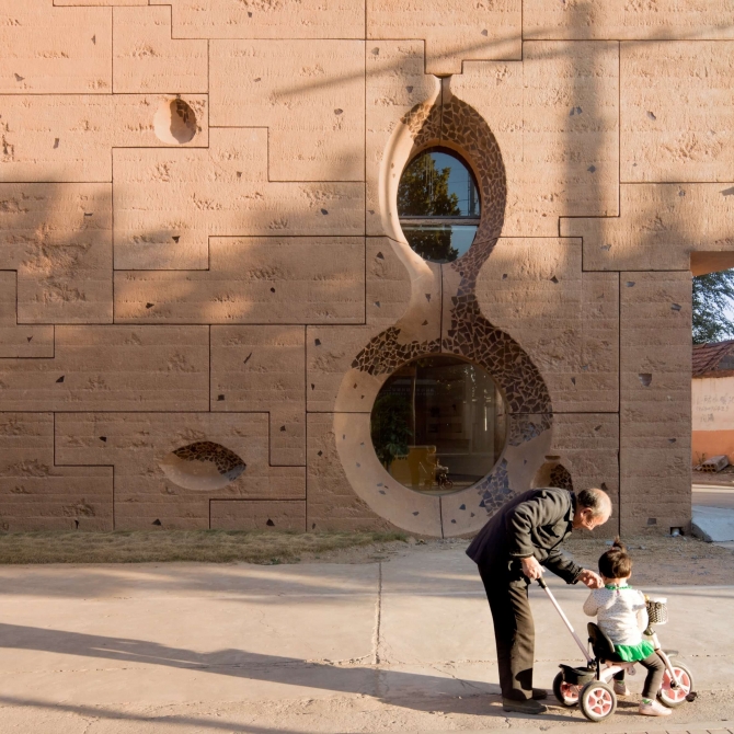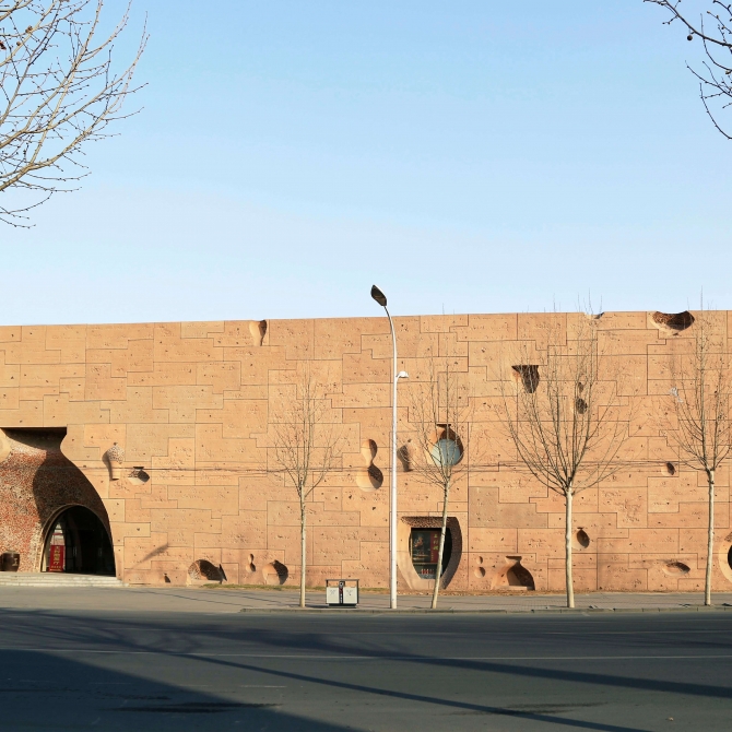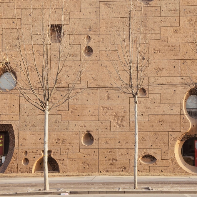 醋的古老歷史和壇子、罐子等古樸的容器給予設計者最初的靈感。建筑是個簡單的立方體,老子說“大象無形、大音希聲”。建筑立面的紋理猶如地質學上的斷層剖面,使得建筑猶如從地下生長出來一般,而立面上的凹槽則是埋在地底的古代容器印在立方體上的痕跡。