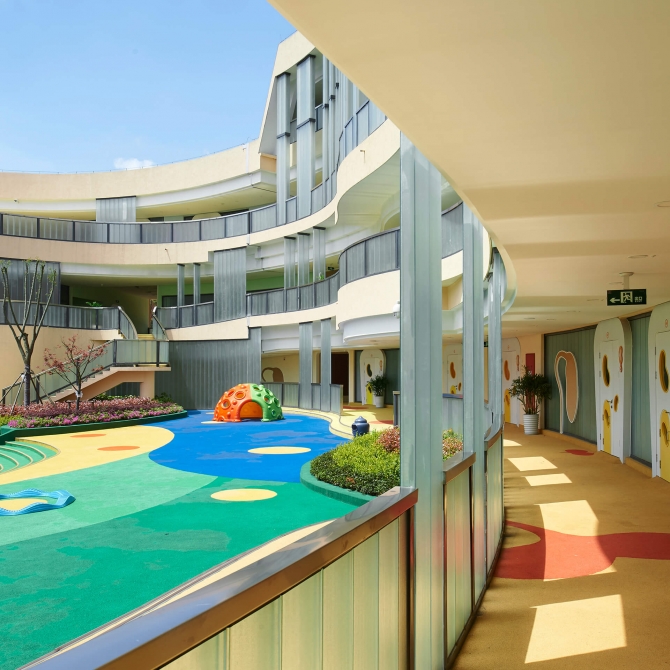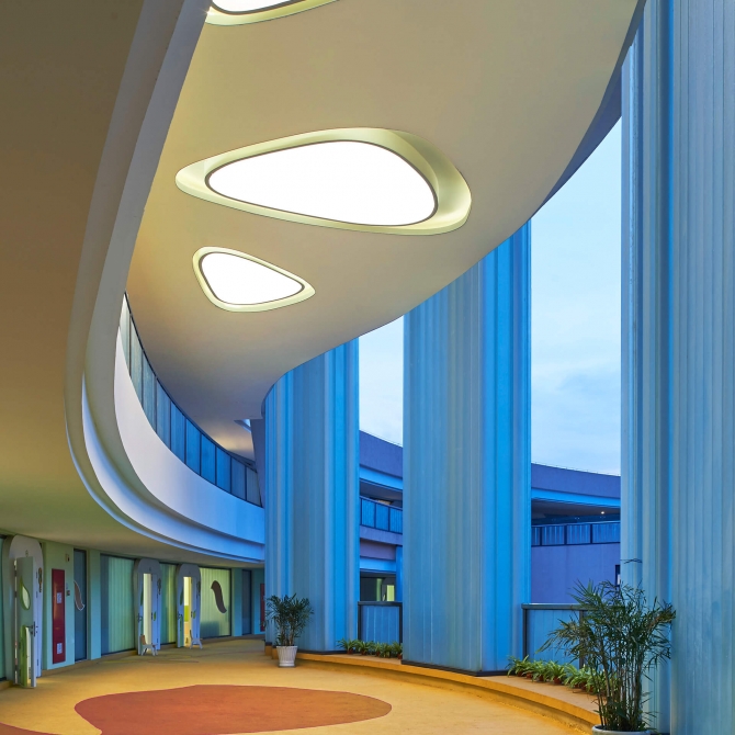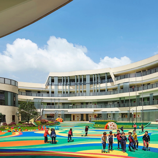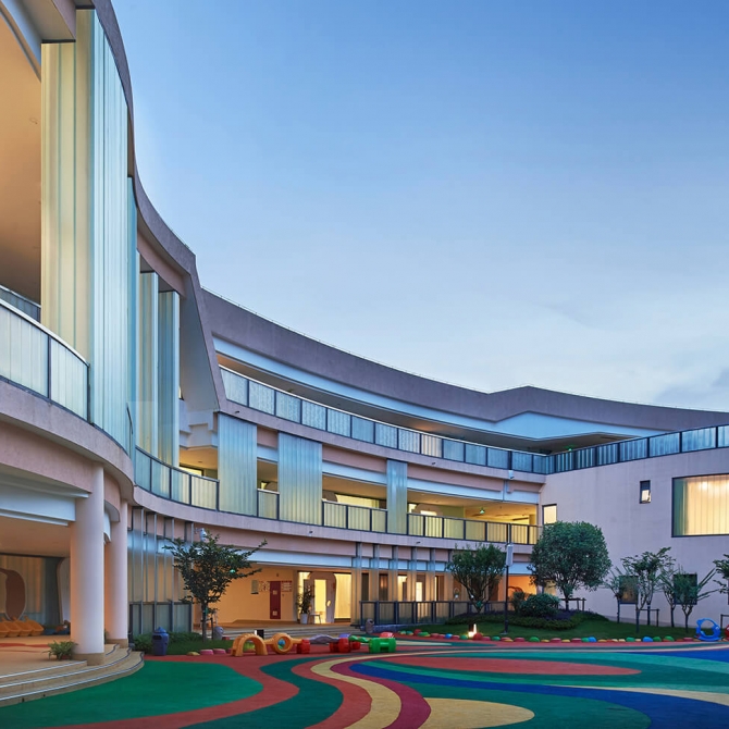 海亮國際幼兒園是一座大型寄宿制幼兒園,設計可容納500名兒童。設計基于對幼兒心理安全性與趣味性需求進行充分的響應,并關注獨特復雜地域環境的場地因素,以兒童的視角和兒童的體驗為原始出發點,以簡約而豐富的設計手法,力求創造出一個真正為兒童所喜愛的、歡樂的、安全的、并且充滿趣味的空間場所。