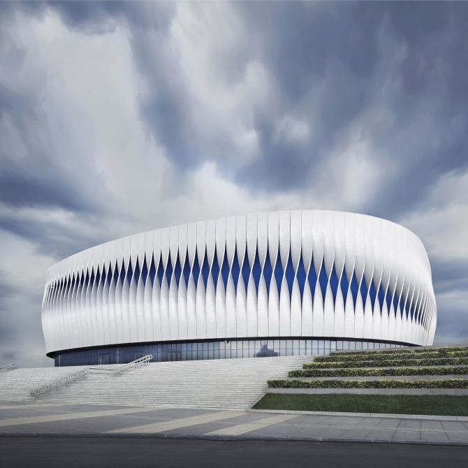 體育館方案選擇頗具傳統特色的“燈彩”建筑造型,采用“藍白”作為建筑主色調,力求與校園及城市的人文特色相結合,并能夠彰顯出冬奧會項目的特質。從著名的張家口市蔚縣剪紙藝術中汲取營養,外圍很像剪紙,內部是彩色的,遠看酷似燈籠。就像一個被旋轉了180°的紙片,能夠增加律動感。