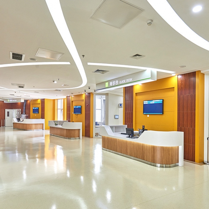 門診大廳:是醫院直接對外開放的區域和窗口,其設計特點應表現明快、順暢、簡潔、大方的特色,在設計中選擇淡雅柔和的米色、乳白色等為主調,材料使用以經久耐用的人造石英石地面、石材和抗貝特板墻面以及金屬板吊頂等為主。同時,作為醫院和城市的窗口,在適當的位置引入反應地域文化特征和醫院特點的裝飾設計手法,為醫院的公共空間注入鮮明的個性也是設計所突出的重點之一。