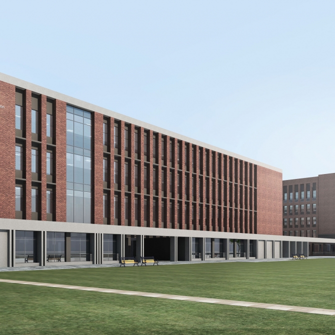 設(shè)計(jì)本身采用半圍合的布局形式,通過建筑體量的開合關(guān)系對(duì)冬季夏季室外風(fēng)環(huán)境進(jìn)行設(shè)計(jì),同時(shí)盡可能保證一種規(guī)則方正的建筑形體,降低建筑由于形體凹凸產(chǎn)生的能源消耗,立面的設(shè)計(jì)延續(xù)了體量簡潔高效的特征,利用連續(xù)的長跳窗解決了進(jìn)深較大的教室內(nèi)部的采光問題。
