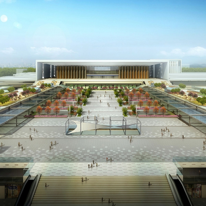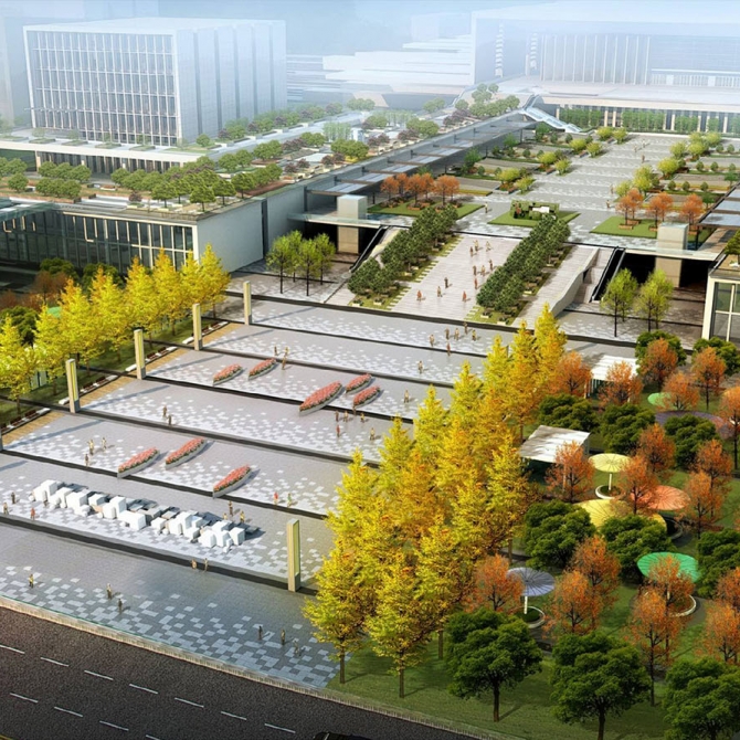 國鐵車站作為城市景觀軸的焦點,由國鐵站房東廣場及西廣場向東向西延伸成城市綠軸,廣場上方布置綠化平臺,成為城市中心的綠肺,
