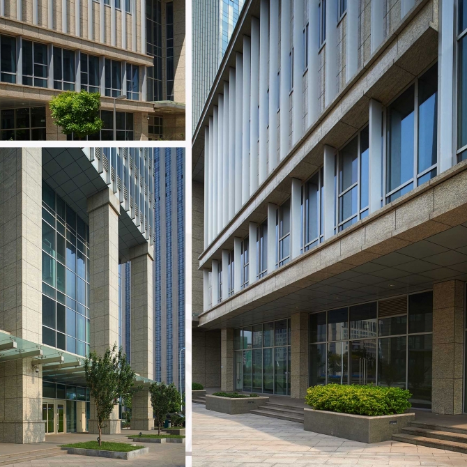 用于基地呈不規(guī)則形狀,為保證建筑退線與周邊道路相互平行,建筑主要平面呈平行四邊形,設(shè)計(jì)在經(jīng)濟(jì)合理的原則上,盡可能地增加有效使用面積。建筑外觀以淺灰色鋁板與玻璃為主要建筑材料,錯(cuò)落有致的構(gòu)件排布反映了自然山水的天然紋理,使沿河的建筑形象更加生動(dòng)活潑。本項(xiàng)目建成后已經(jīng)成為響螺灣商務(wù)區(qū)重要的標(biāo)志性建筑。