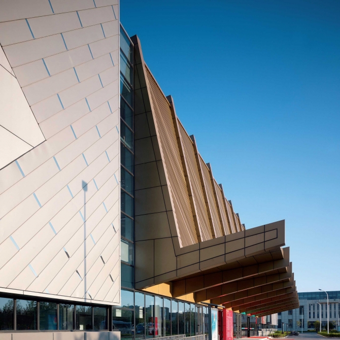 天津工業(yè)大學(xué)前身是紡織學(xué)院。本場(chǎng)館在建筑外表皮的設(shè)計(jì)中運(yùn)用多種線條編織手法,再現(xiàn)紡織理念。鋁合金板材的各種選型精心搭配,形成了多樣化的機(jī)理模式。建筑西側(cè)的主入口空間采用金色鋁方通折板結(jié)構(gòu),巨大的挑檐突顯了宏偉的氣勢(shì)。建筑金色與金屬色的合理運(yùn)用與周邊體育館的色調(diào)相匹配,強(qiáng)調(diào)了體育中心的整體感。西側(cè)主墻面上點(diǎn)綴很多不銹鋼拋光格片,在天光的照射下熠熠生輝,給場(chǎng)館建筑增添許多靈動(dòng)之感。南北西側(cè)玻璃幕墻與金屬楔形結(jié)構(gòu)互相穿插構(gòu)成了側(cè)面入口的趣味空間,豐富的表情加強(qiáng)了本場(chǎng)館與周邊環(huán)境的對(duì)話關(guān)系。