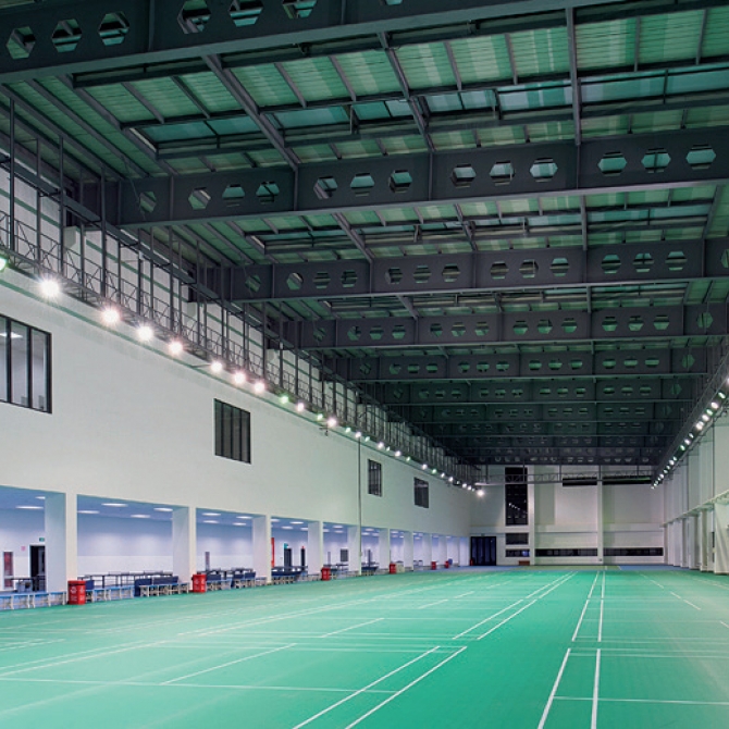 場(chǎng)館室內(nèi)擁有各類球場(chǎng)及各種健身館,室外則擁有主席臺(tái)和觀眾席位,使風(fēng)雨操場(chǎng)與運(yùn)動(dòng)場(chǎng)的功能完美結(jié)合。室內(nèi)首層大空間部分設(shè)置需較高層高的網(wǎng)羽場(chǎng)地,局部二層下面設(shè)置乒乓球運(yùn)動(dòng)區(qū)。平面布局緊湊,利用率極高。二層采用單側(cè)走廊的交通模式,多個(gè)健身館并聯(lián)式布局,方正的場(chǎng)館空間便于開(kāi)展各種類型的健身活動(dòng)。
