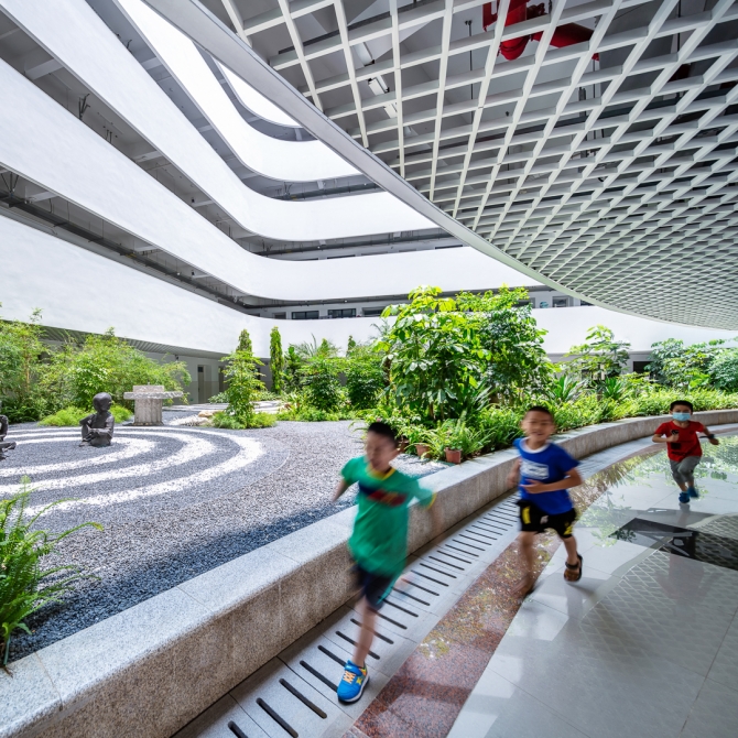綠地結合建筑布置,增加公共空間的駐留性。用公共空間有效連接各功能空間,實現空間活躍有序與功能完整集中的有機統一。利用高差的分層設計自然地區隔了體育活動場地和教學活動場地,既互不干擾又相互關照。