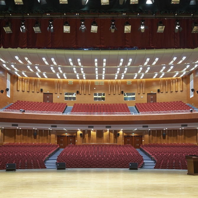 遼寧交通高等專(zhuān)科學(xué)校學(xué)生活動(dòng)中心為包含禮堂的兩個(gè)相對(duì)獨(dú)立的功能體組合在一起,其中學(xué)生活動(dòng)中心位于建筑南部。鑒于主要人流方向的考慮,將不同使用需求的人流有效分開(kāi),首層?xùn)|南側(cè)為學(xué)生事務(wù)辦理大廳,西南側(cè)多功能廳即可作為會(huì)議活動(dòng)等功能空間使用,更可通過(guò)內(nèi)廊與禮堂后臺(tái)連通,必要時(shí)可作為大型演出候場(chǎng)之用,極大程度上合理利用空間,各空間均有獨(dú)立出入口避免人流交叉相互干擾。禮堂位于建筑北部,主入口位于東側(cè),與學(xué)生宿舍區(qū)距離26米,前區(qū)形成開(kāi)闊廣場(chǎng),便于大量人流集散。