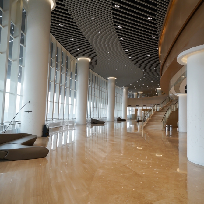 大劇院由兩個劇場組成,主劇場可容納1203人,小劇場可容納500人,完全按照國際建筑聲學原理進行設計裝飾。