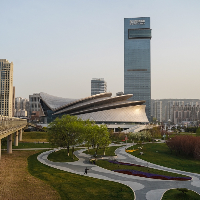 場地設計以開放式藝術公園為主題,以大劇院為中心,將向東橫跨人防隧道出入口建設人行步道,可直通渭河生態公園;向西新建天橋,將廊橋和銀泰城天橋相連接,可直通中華石鼓園。項目建成后,以寶雞大劇院為中心,聯動中華石鼓園、廊橋、東嶺綜合體、渭河生態公園等多個元素,將形成一條完整的步行生態鏈。地面層設置寬度及凈高均不小于4米的環形消防車道,兼為場地內貨運及服務通道。