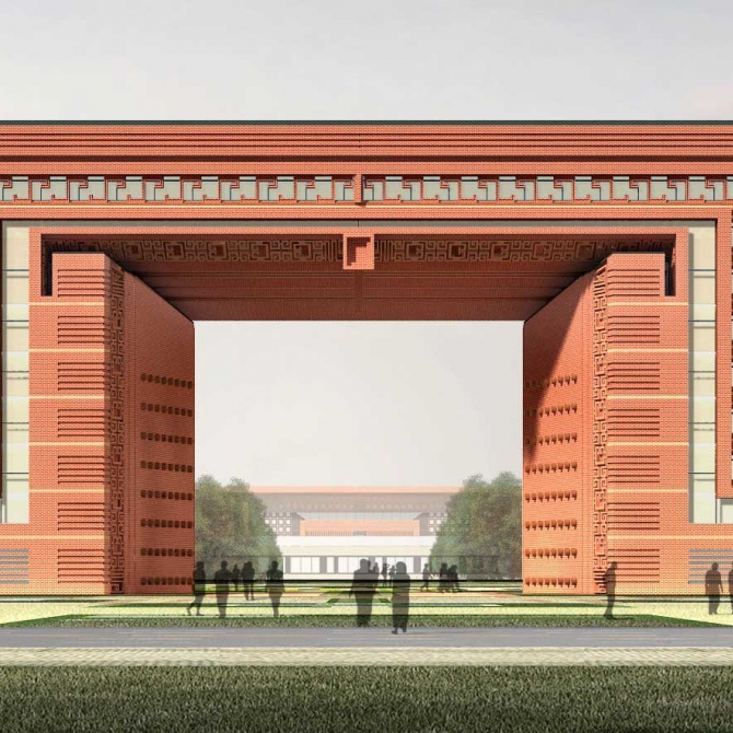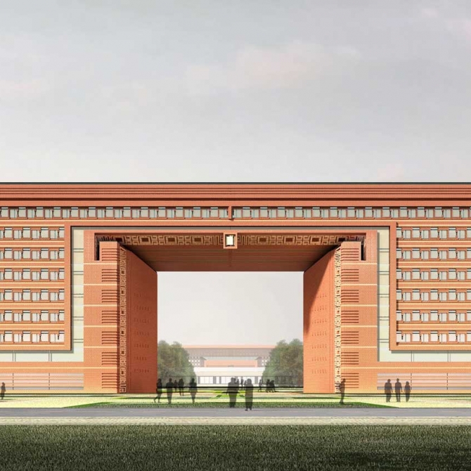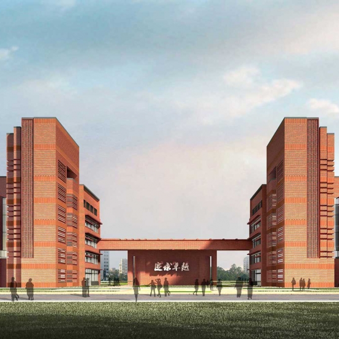 設(shè)計(jì)創(chuàng)新地提出了“躍龍門”的規(guī)劃布局模式。由行政辦公和實(shí)驗(yàn)樓共同形成校園入口主體大樓,并與圖書館、風(fēng)雨操場共同圍合出校園的主入口,打造了一個吉祥大氣校園主入口空間。學(xué)生經(jīng)過鯉池,穿過龍門完成升華,取自“魚躍龍門”的吉祥寓意。在大氣中彰顯浪漫情懷,在傳統(tǒng)中展露現(xiàn)代風(fēng)采。