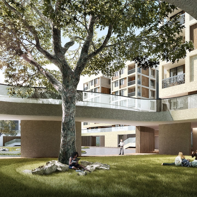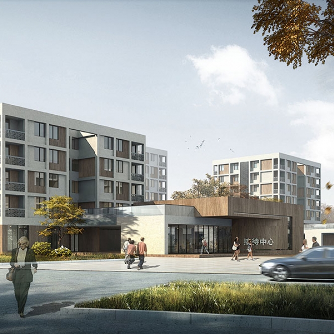 項(xiàng)目位于天津市西青區(qū)天津師范大學(xué)新校區(qū)內(nèi),總建筑面積12500平方米,滿(mǎn)足380位留學(xué)生入住。本案位于校園北側(cè),其主要人流來(lái)自南側(cè)教學(xué)區(qū)和生活區(qū)。廣場(chǎng)出入口處設(shè)接待中心,醒目便捷。廣場(chǎng)內(nèi)部實(shí)行人車(chē)分流,僅允許行人和非機(jī)動(dòng)車(chē)進(jìn)入,行人亦可通過(guò)首層架空灰空間到達(dá)校園主環(huán)路及校園濕地景觀。優(yōu)美弧線(xiàn)的室外觀景平臺(tái),宛如一條紐帶將錯(cuò)落有致的宿舍有機(jī)聯(lián)系到一起,內(nèi)側(cè)形成一個(gè)半圍合的景觀庭院。本案采用白色和仿木紋水泥纖維板作為建筑外檐材料。通過(guò)簡(jiǎn)潔的白色骨架,木色和白色相間的建筑墻面的設(shè)計(jì)元素和手法,體現(xiàn)中式匠心獨(dú)運(yùn)的文化內(nèi)涵。