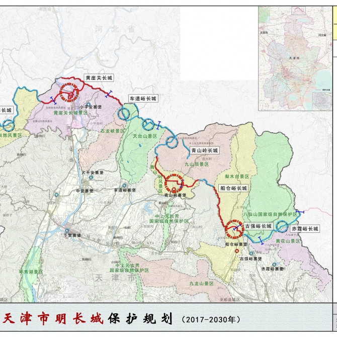 天津明長城保護規劃的編制是在《全國長城保護規劃編制導則》指導下完成的省段長城保護規劃。在研究層面,搜集并整理了大量的關于天津市明長城及相關漕運、古代陸路交通、天津市、薊州區的發展史資料,評估挖掘長城所蘊含的價值。新技術手段應用方面,利用無人航拍飛機技術與儀器,進行低空攝影,彌補長城資源環境調查的空白,提高調查質量。