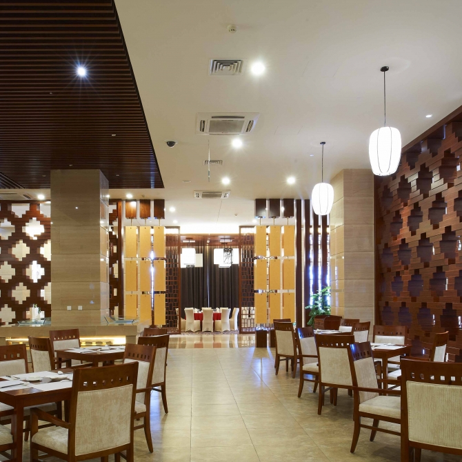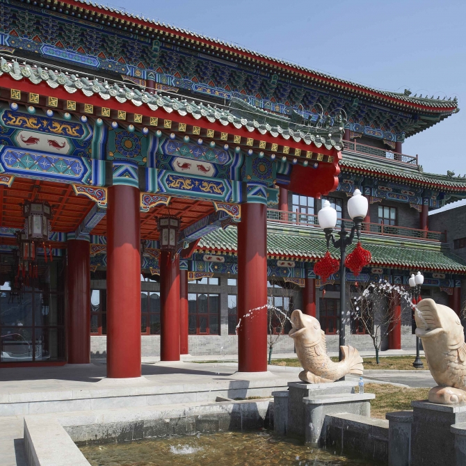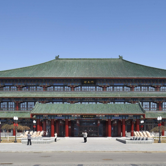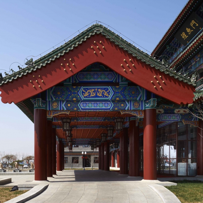 本項(xiàng)目建筑風(fēng)格為仿明清北方傳統(tǒng)中式古建筑,主體為三層廡殿建筑,兩側(cè)為兩層硬山與三層歇山建筑,采用中心對(duì)稱的手法,主入口與望海樓遙相呼應(yīng)。商務(wù)中心包括餐飲、會(huì)議及客房,形式規(guī)整。