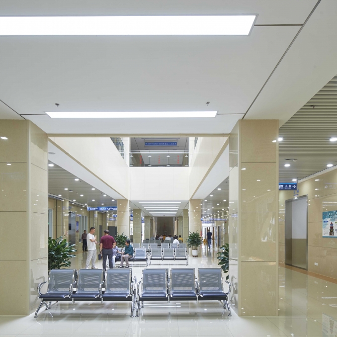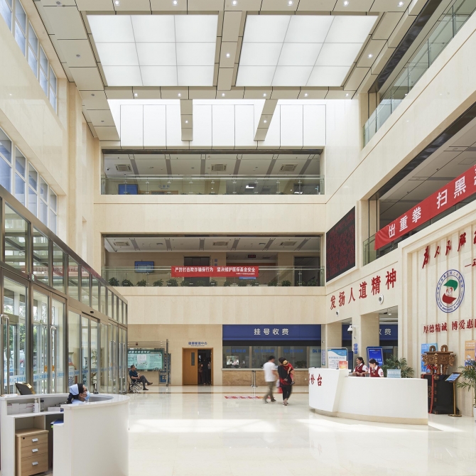武清第二人民醫院主要含三層門診醫技樓、十一層住院樓,及單建的發熱、感染門診和動力中心。門診醫技樓按診區展開并圍合成為若干院落空間,達到良好的通風采光效果;住院樓獨立設置,與門診樓形成有機聯系,并為醫院留出發展擴建用地。