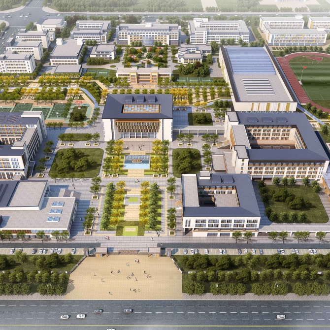 在設計中,我們以現代書院為設計主題,以院落為空間結構組織基本元素,設置“學術禮儀軸”和 “綠色共享軸”統領整個空間格局。學術禮儀軸貫穿南北,串聯起園區中的重要禮儀節點,是對老一中校園的延續,同時加以提煉、整合、烘托,新老相依,渾然一體,成為教育園區精神文化體現的禮儀軸線。綠色共享軸串聯南北,以林蔭大道為設計主體,輔以慢跑道、小球場、活動場地的設置,使其成為園區內各個學部共享的“校園綠肺”。