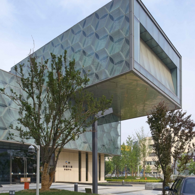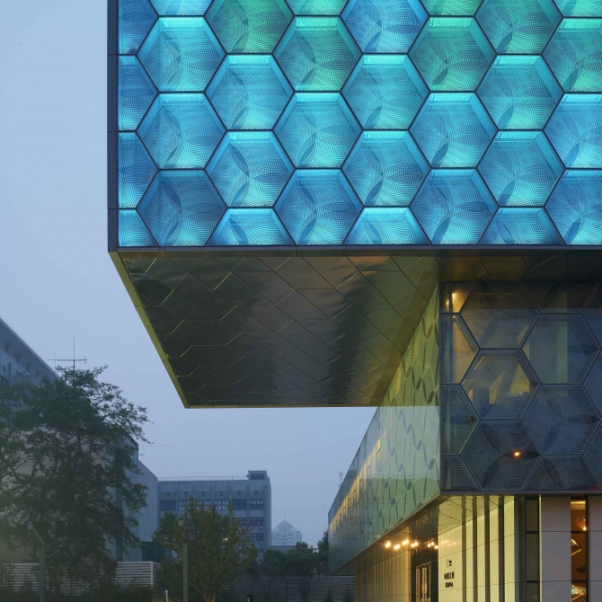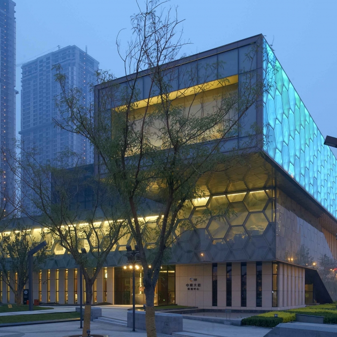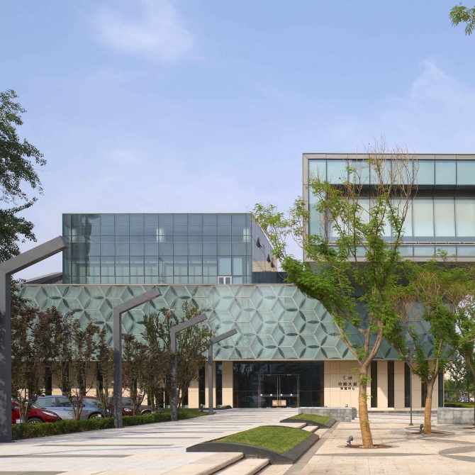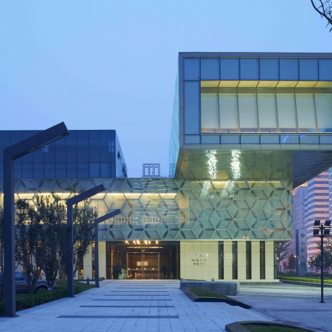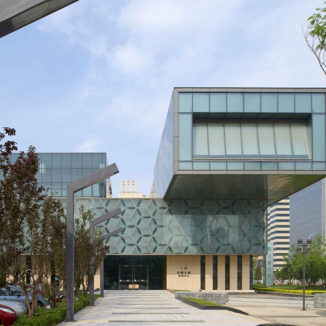 中糧天津六緯路項目體驗中心用地為“L”形,建筑形體根據地形條件設計為依地形盤旋生長的形式,形成內院和共享中庭,提供模型展示和顧客休息場所,退讓的距離也減少了對周圍既有建筑的影響,并形成了環狀的消防車道。主入口設在西側面向六緯路和地鐵站,入口大氣明顯,起到引導顧客流線的作用。 建筑立面采用玻璃幕墻形式,局部外墻采用干掛石材,以體現質感和力度感。玻璃幕墻采用雙層幕墻與單層幕墻相結合的形式,依據建筑體量的盤旋生長的形式采用雙層正六邊形幕墻加以突出,體現建筑的流動性。雙層玻璃幕墻形式以中糧集團標志為設計原型,以正六邊形彩釉玻璃加以圖案修飾予以體現,充分體現建筑的個性化、標識性,展示產品形象,體現公司實力。